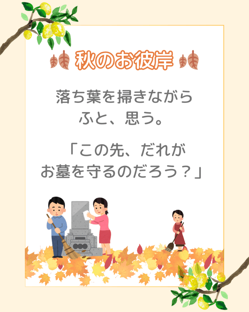 落ち葉が舞うこの季節、ご先祖さまに感謝を伝えるとともに、未来の家族が安心できる「永代供養」という選択肢について考えてみませんか。